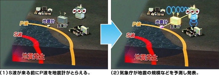 地震时,在经历被称作P波[1]微小晃动后,被称作S波[2]的巨大晃动就会到来。紧急地震速报即是捕获P波,预测出地震的规模和震源地,在S波到来之前的数秒到数十秒前发布的消息。气象厅在预测到震度5弱以上的地震时就会发布消息。