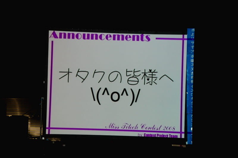 一开始是Announcements,分别用三种语言进行了广播:日语,英语和面向宅男的语言(这个非常强)。刚听到第三段的时候差点被萌翻了,那声音实在太专业了,完全可以去当声优了。